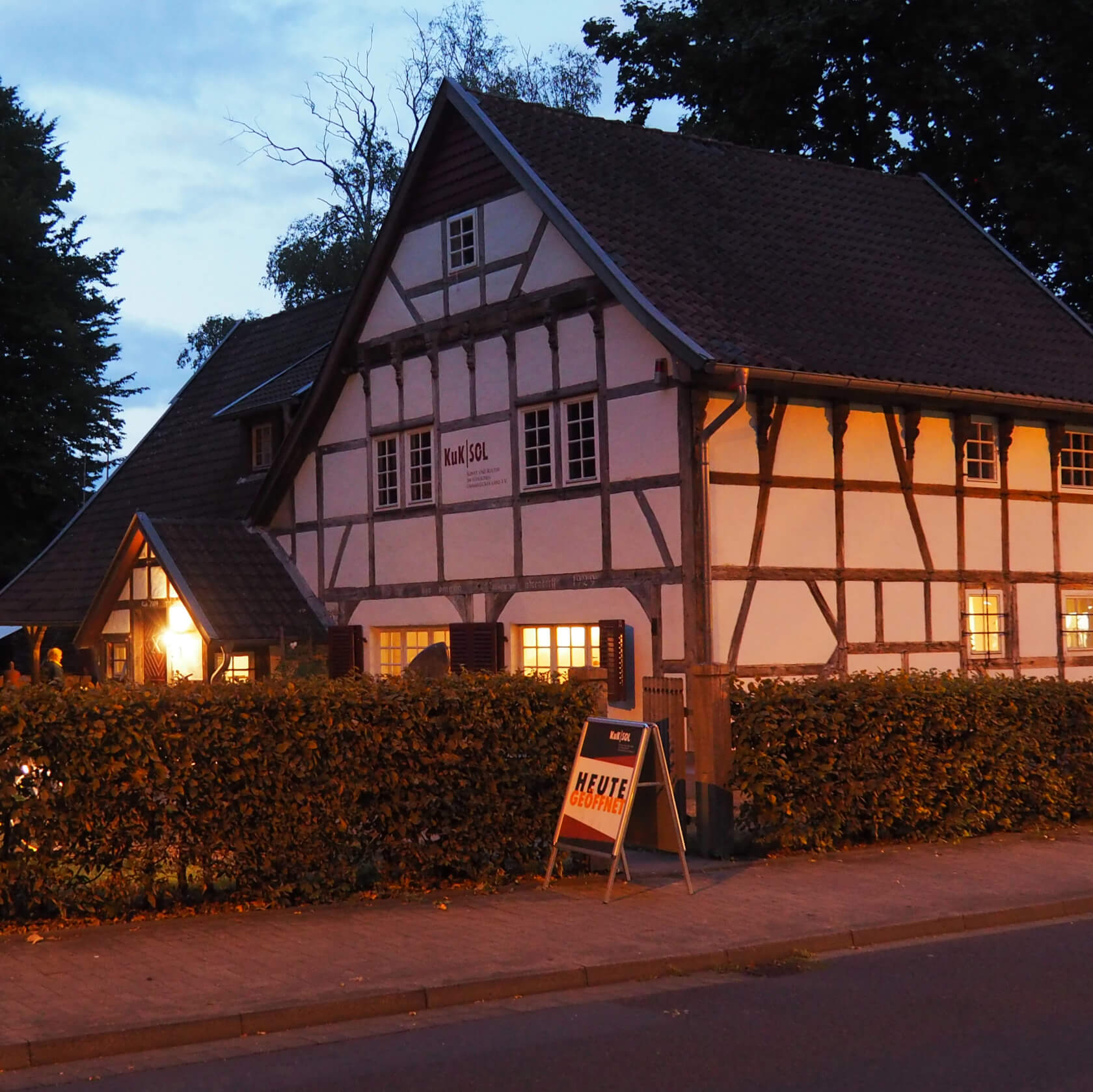 Die Veranstaltung findet im Garten des KuK-Hauses statt, dieser ist teilweise mit Segeln bestückt.